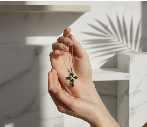 SKS Natural Russian Diopside and Zircon Cross Pendant Necklace